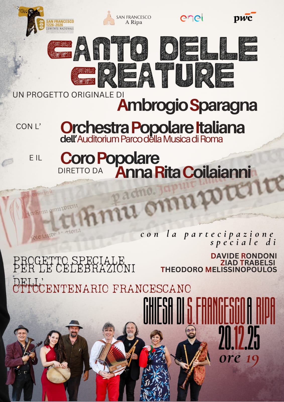 A San Francesco a Ripa Grande – dove secondo la tradizione Francesco durante un suo soggiorno a Roma trovò accoglienza; in quell’area di Trastevere, allora vicina al porto fluviale (“ripa”) del Tevere – prosegue il percorso delle celebrazioni dell’Ottavo Centenario francescano con un appuntamento di forte valore simbolico e artistico: venerdì 20 dicembre 2025, alle ore 19, pè andato in scena “Canto delle Creature”, progetto originale di Ambrogio Sparagna, con l’Orchestra Popolare Italiana dell’Auditorium Parco della Musica di Roma e il Coro Popolare diretto da Anna Rita Colaianni. L’evento si inserisce come progetto speciale nell’ambito delle iniziative dedicate all’orizzonte dell’800° anniversario della morte di San Francesco (2026), mettendo al centro la forza contemporanea del Cantico: una lingua che attraversa i secoli e continua a parlare a comunità, giovani e istituzioni.