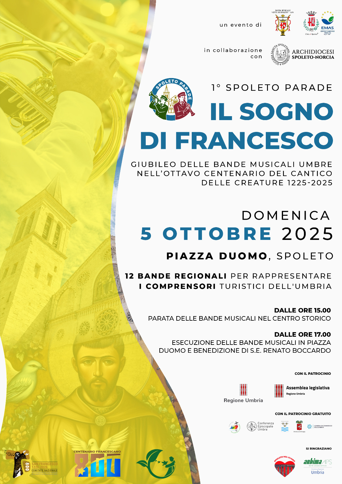 Saranno presenti 12 bande umbre, una per rappresentare, ciascuna i 12 comprensori turistici della regione a simboleggiare l’abbraccio dell’Umbria intera unita in un unico “cantico” nell’anno del Giubileo 2025 e 1 o più bande extra regionali.