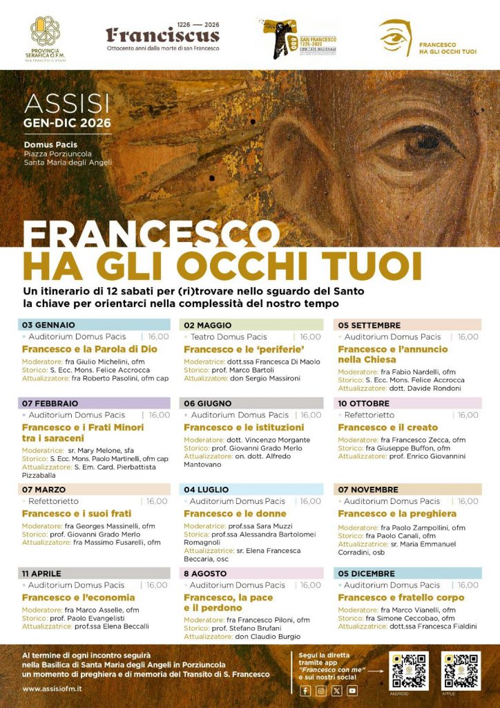 La Provincia Serafica di San Francesco dei Frati Minori di Umbria e Sardegna, con il patrocinio del Comitato nazionale per la celebrazione dell’ottavo centenario della morte di San Francesco di Assisi, propone una delle iniziative più significative dell’anno 2026: Francesco ha gli occhi tuoi.