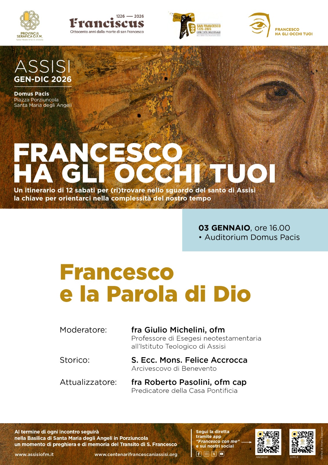 Il primo incontro di sabato 3 gennaio incentrato sul tema “Francesco e la Parola di Dio” vedrà la partecipazione di Mons. Felice Accrocca Arcivescovo di Benevento come storico, di fra Roberto Pasolini Predicatore della Casa Pontificia OFM cap come attualizzatore, e di fra Giulio Michelini OFM Professore di Esegesi neotestamentaria nel ruolo di moderatore.